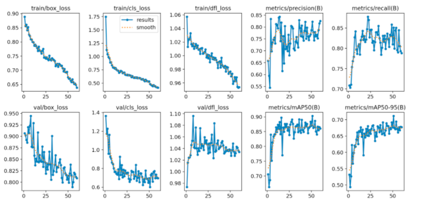 关键 loss 函数随 epoch 增加持续下降,表明模型随着训练的深入精 度会提升。同时在各项指标上取得良好的精度。